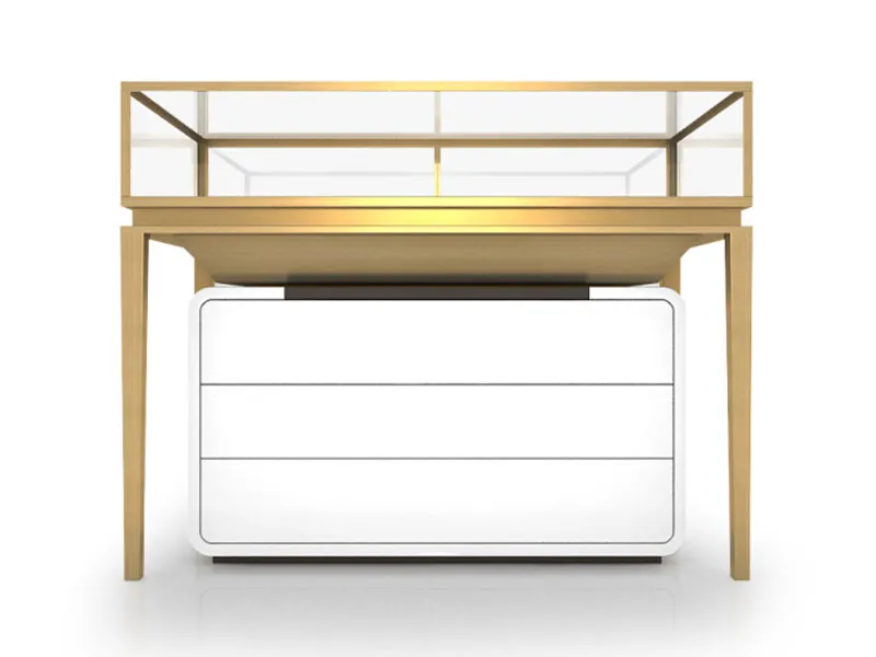 Детали конструкции ювелирных изделий: Нижняя часть оснащена многослойными белыми выдвижными ящиками, которые могут быть классифицированы для хранения ювелирных изделий в соответствии с потребностями хранения; ножки из золотистого металла выполнены в простом и атмосферном дизайне, поддерживая всю витрину, что делает общий стиль единым и многослойным.