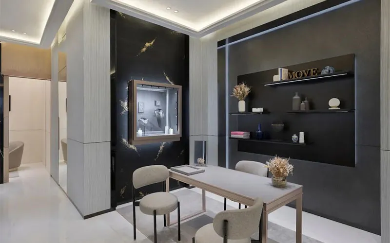 Созданный Валери Мессика в соответствии с ценностями Дома, просторный бутик площадью 70 квадратных метров сочетает в себе роскошь, современное творчество, чистые графические линии и минимализм. От полированной серой сосны и розовых металлических деталей цвета шампанского до мрамора и зеркал со скошенными краями — все материалы образуют неповторимый ансамбль.