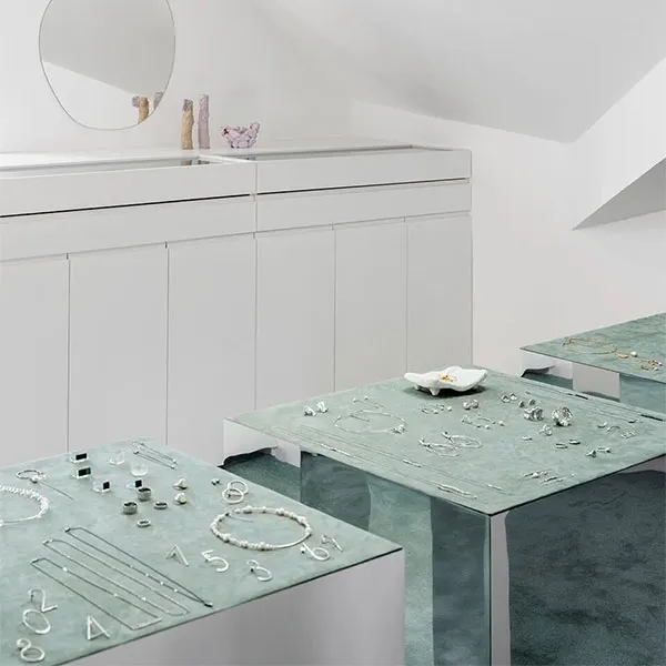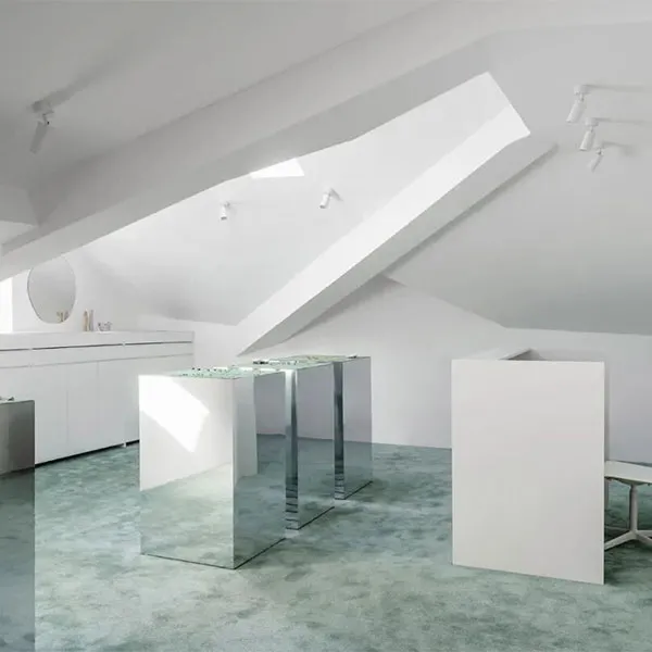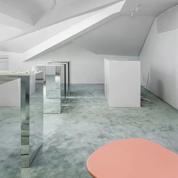 Эта комната занимает двойной наклонный склон. Благодаря этому она получает достаточно естественного света, что имеет первостепенное значение для ювелирного магазина. Пространство отличается необычной геометрией потолка. В сочетании с монастырскими окнами в крыше цвета аквамарина оно напоминает пейзажи Сардинии или Греции. Именно поэтому материалы интерьера повторяют цвета, открывающиеся за окнами. Это позволяет внешнему пространству более глубоко проникать в интерьер.