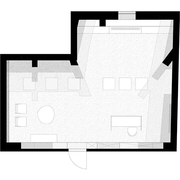 Красота потолка сопоставима только с пространственной сложностью помещения. Из-за конструкции здания полезная площадь оказалась в несколько раз меньше, чем предполагалось. Тем не менее, мы обнаружили идеальную открытую планировку витрин в этом пространстве, позволяющую посетителям свободно циркулировать вокруг них со всех сторон без препятствий. Стеклянные витрины были встроены в подоконники, обеспечивая дополнительные поверхности для временных выставок керамики.